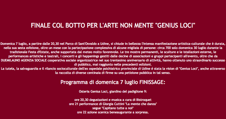 Aperta all'ex OPP di sant' Osvaldo "Genius loci- oltre l'ex manicomio", rassegna con più di quaranta artisti che hanno raccontato la nuova anima di quello che fu uno dei più grandi ospedali psichiatrici d'Italia prima della legge Basaglia.